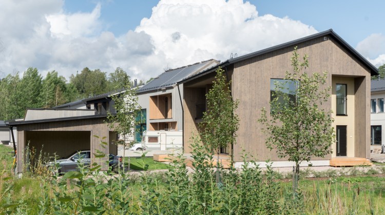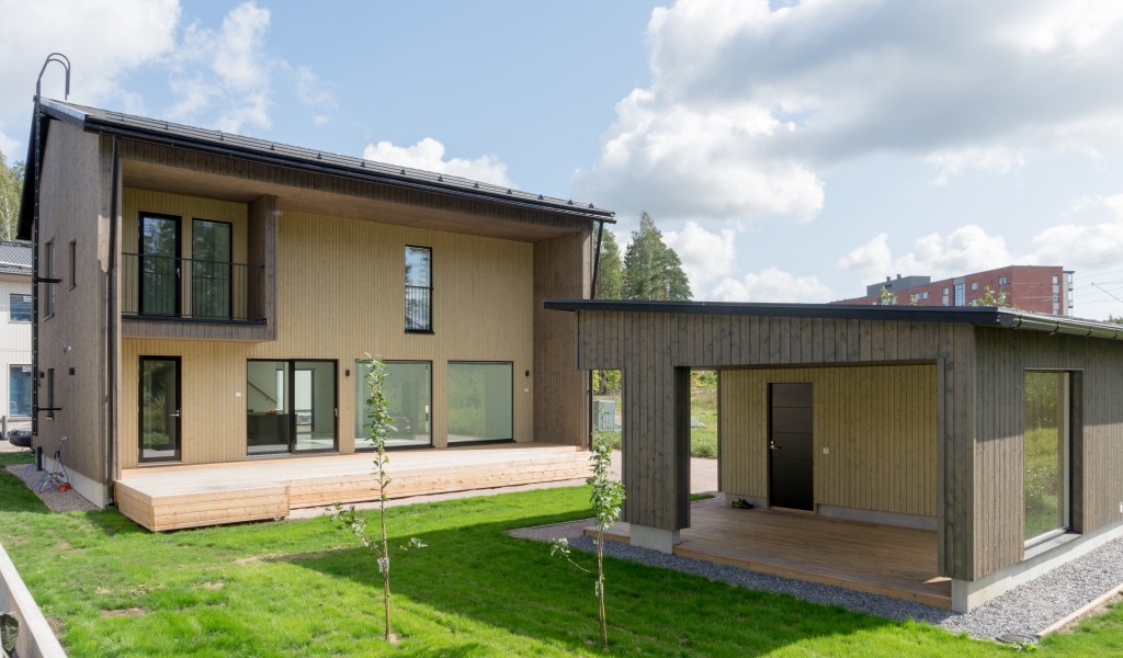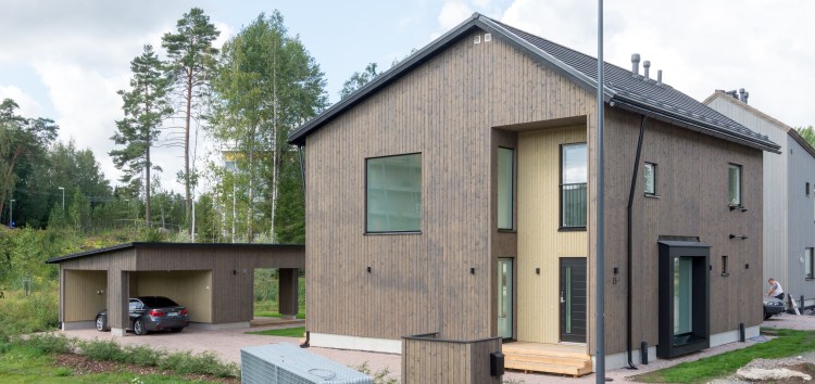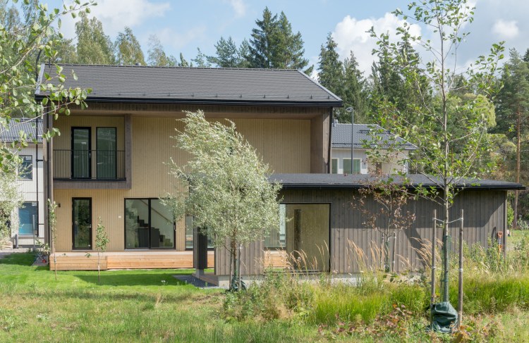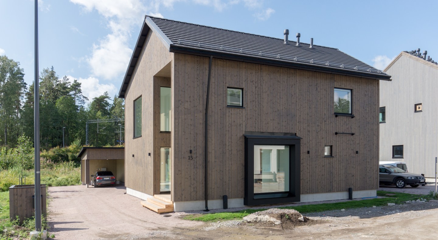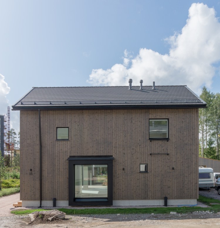 Talo B sijoittuu tasaiselle tontille päättyvän kujan viimeiseksi taloksi junaradan varteen. Pystyverhotut rakennukset muodostavat suojaisan pihapiirin, jossa talousrakennuksen terassikatos toimii raidemelulta suojattuna ulko-oleskelutilana. Talon ikkuna-aukotus perustuu harkitusti sijoiteltuihin neliön muotoisiin aukkoihin. Päärakennuksen toispuoleinen harjakatto on sileäpintaista tiiltä. Taloon tullaan sisään rakennuksen kulmasta tilavaan ja valoisaan eteiseen, josta siirrytään suureen yhtenäiseen oleskelutilaan, joka on osittain kahden kerroksen korkuinen. Oleskelutilaan tulee valoa kolmesta eri suunnasta ja tilan voi avata liukulasiovella suurelle lehtikuusiterassille. Alakertaan sijoittuvat saunatilat, joista on käynti kodinhoitohuoneen kautta vilvoittelemaan. Suorat portaat vievät talon keskellä nousevat valoisaan aulatilaan, josta käydään neljään makuuhuoneeseen ja kylpyhuoneeseen.