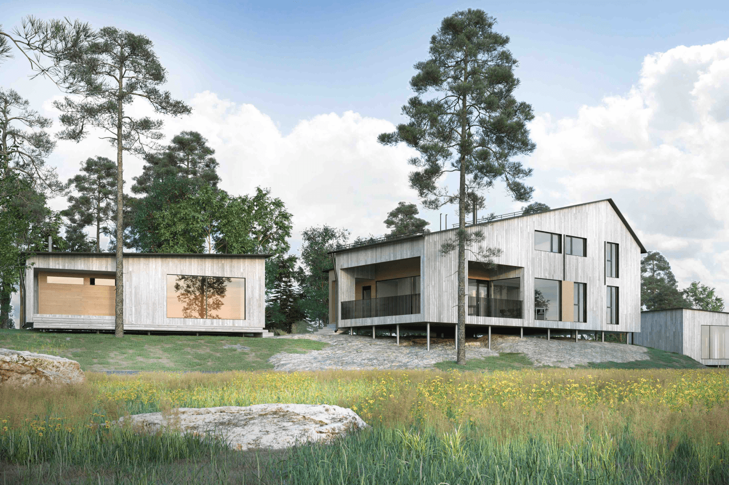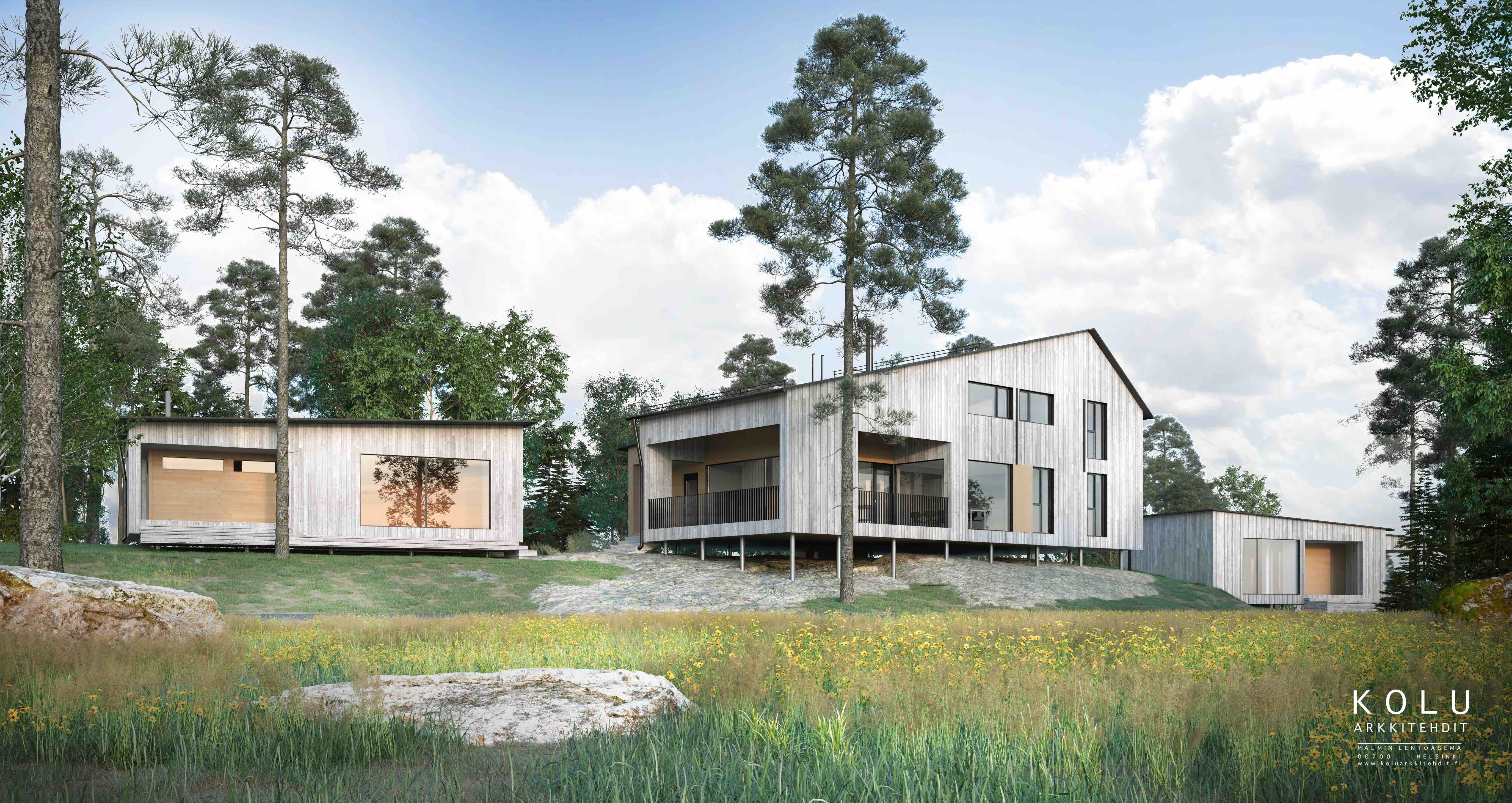 Rakennukset sijoittuvat kolmion muotoiselle kallioiselle tontille siten, että sinne saavutaan kapeasta itäpäästä, jossa sijaitsevat autopaikat ja erillinen sivuasunto. Päärakennukselle noustaan tontin pohjoisrajaa pitkin, jonne muodostuu mukava kallioinen sisäänkäyntipiha. Saunarakennus yhdessä päärakennuksen kanssa muodostavat aurinkoisen oleskelupihan tontin lounaiskulmaan. Tontilla sijaitsevia puita säästetään ja avokalliota jätetään paikoin näkyville. Rakennukset on perustettu teräspilarien varaan ja ne ikäänkuin leijuvat ilmassa. Kaikki kantavat rakenteet ovat ristiinlaminoitua puuta (Cross laminated timber), joka jää suurilta osin sisäpuolella näkyväksi pinnaksi. Ulkopuolelta rakennukset verhoillaan pystysuuntaisella käsittelemättömällä lehtikuusella. Seinärakenteisiin ei laiteta erillistä lämmöneristettä. Päärakennuksessa alakertaan sijoittuvat tilavien oleskelutilojen lisäksi yksi makuuhuone, kylpyhuone, kodinhoitohuone ja varasto. Yläkerrassa on aulatilan lisäksi kolme tilavaa viistokattoista makuuhuonetta ja wc. Saunarakennuksessa on tilavien kylpytilojen lisäksi harrastetila. Sivuasunto on alkovilla ja keittiösyvennyksellä varustettu yksiö. Rakennusten ikkunat ovat pääosin kiiteästi puurunkoon lasitettuja. Ikkunoista avautuu kauniita näkymiä ympäristöön, jossa on runsaasti komeita mäntyjä.